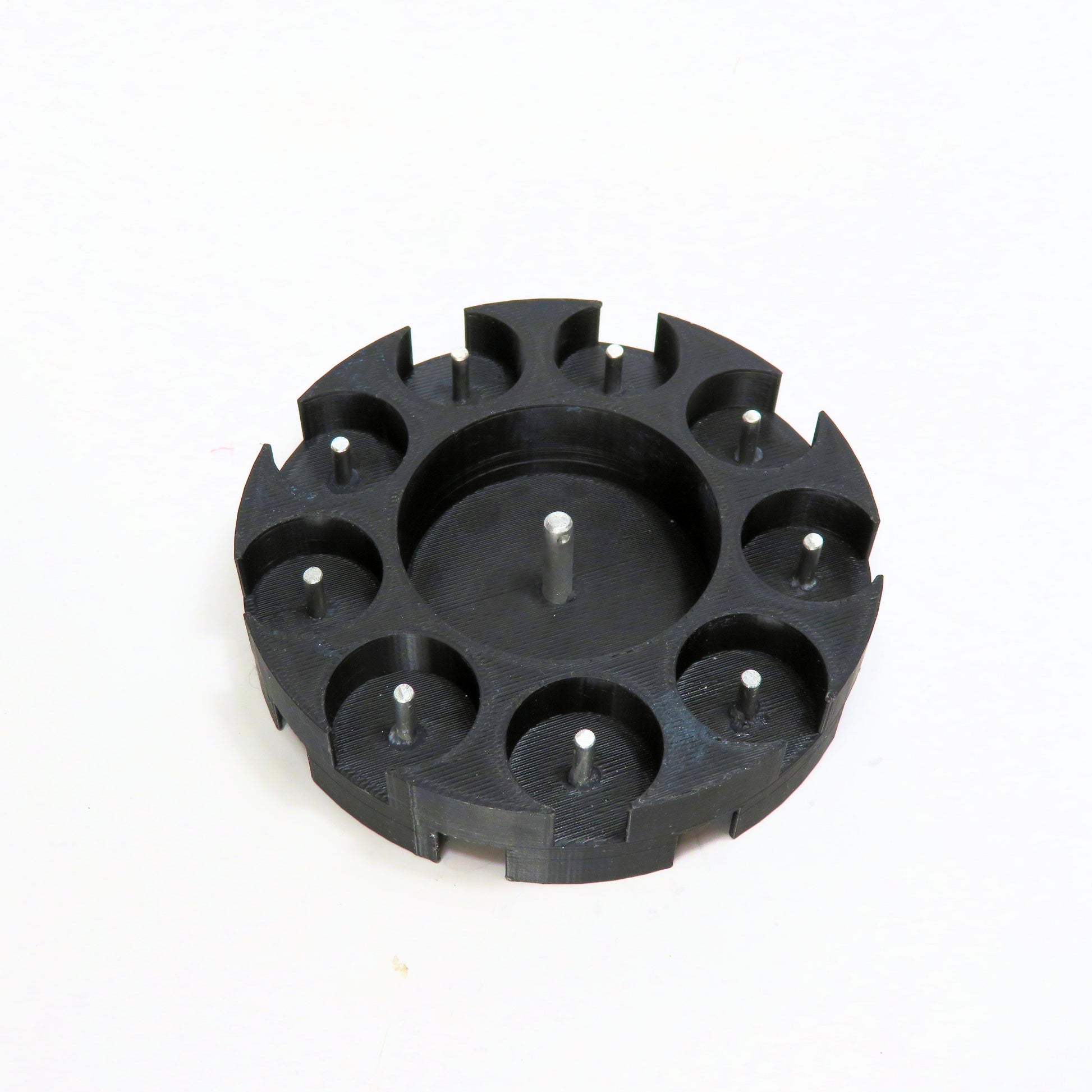 Keep your pinions and spur gears organized and put together with the gear caddy. Holds up to 20 pinions (up to a 38 tooth) and 2 to 4 spur gears. Middle posts made out of Aluminum to keep pinions secure with set screw.