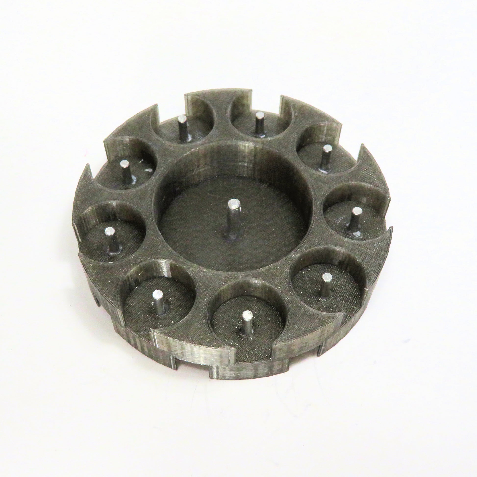 Keep your pinions and spur gears organized and put together with the gear caddy. Holds up to 20 pinions (up to a 38 tooth) and 2 to 4 spur gears. Middle posts made out of Aluminum to keep pinions secure with set screw.